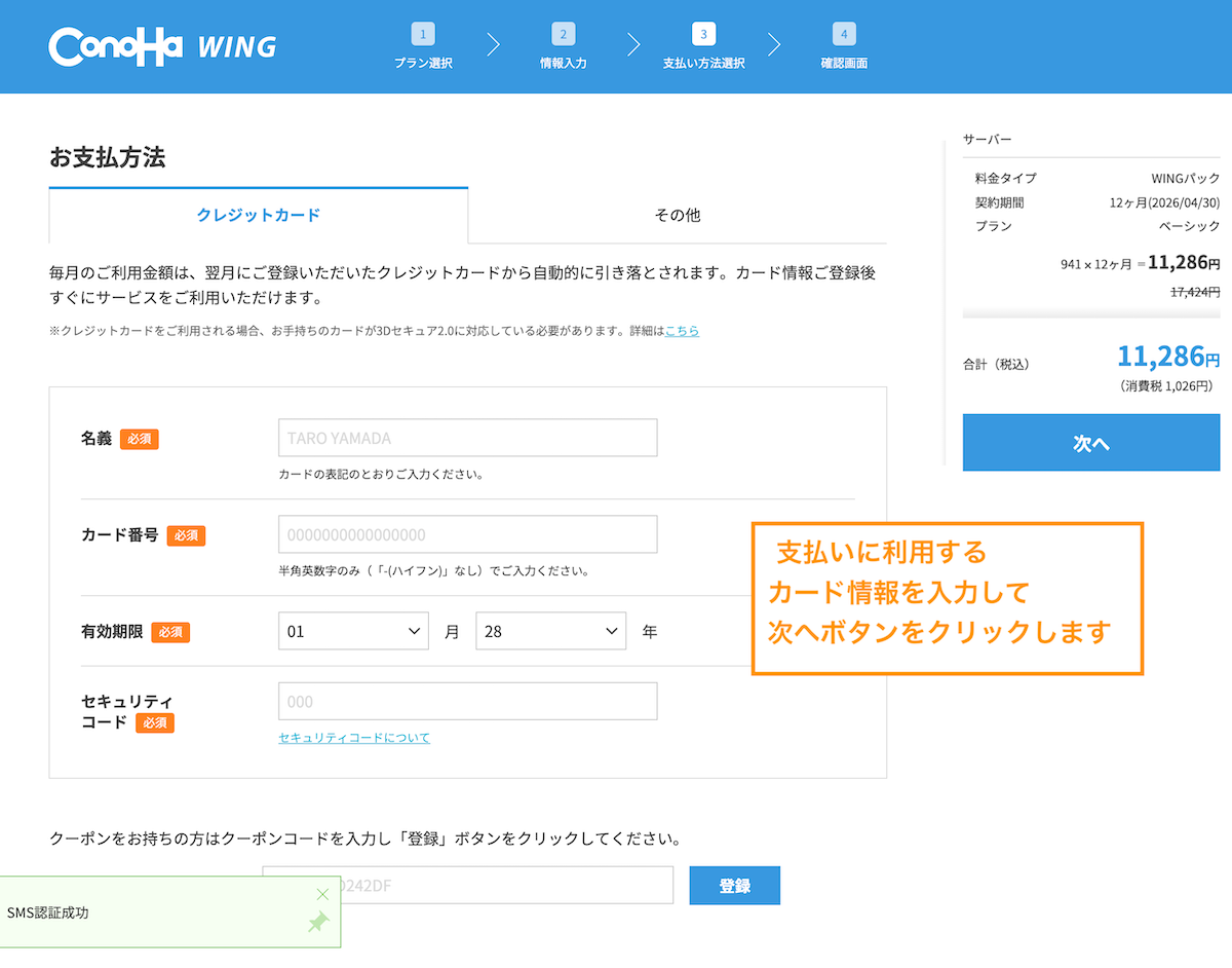支払い情報を入力します。ここでは例としてクレジットカードを選択して次へボタンをクリックします。