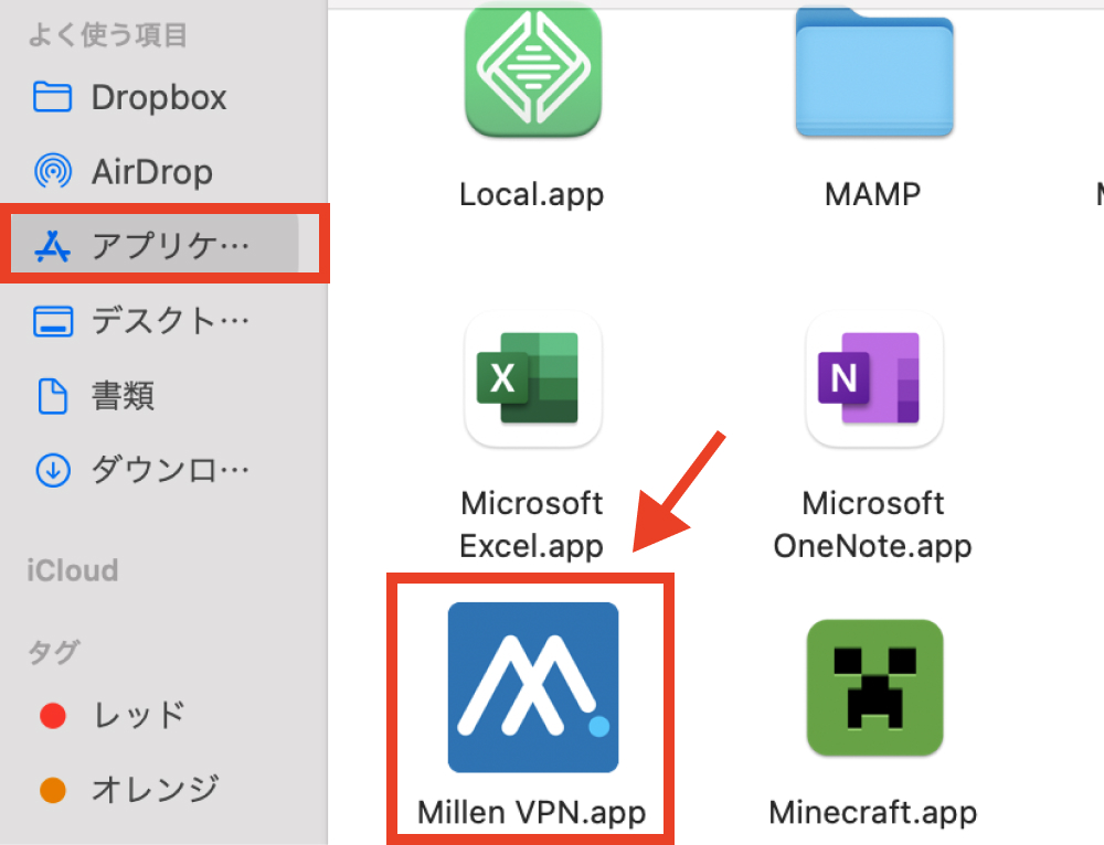 アプリケーションフォルダから「Millen VPN」アプリを起動します。