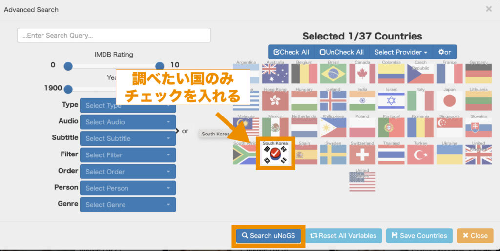 調べたい国以外のチェックを全て外し、「Search uNoGS」をクリックします。(本例では韓国版Netflixのコンテンツを検索。)