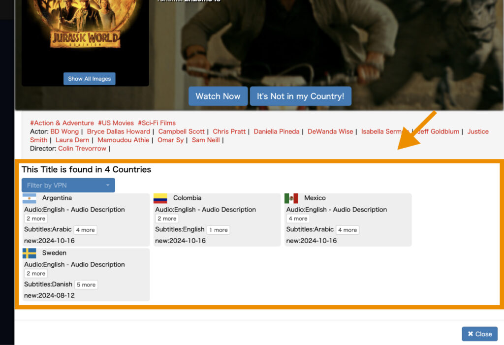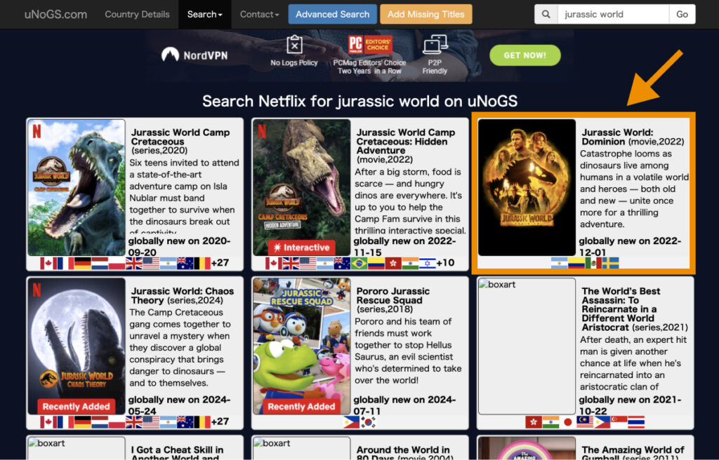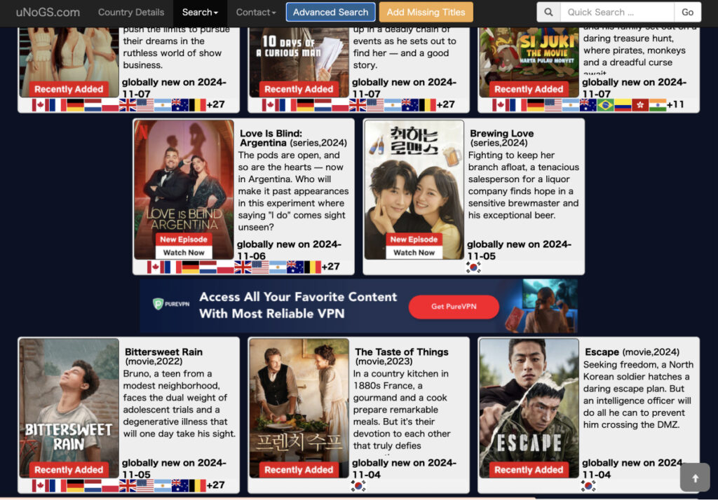 以上で、検索した国のNetflixで見られるコンテンツの一覧を確認できます。