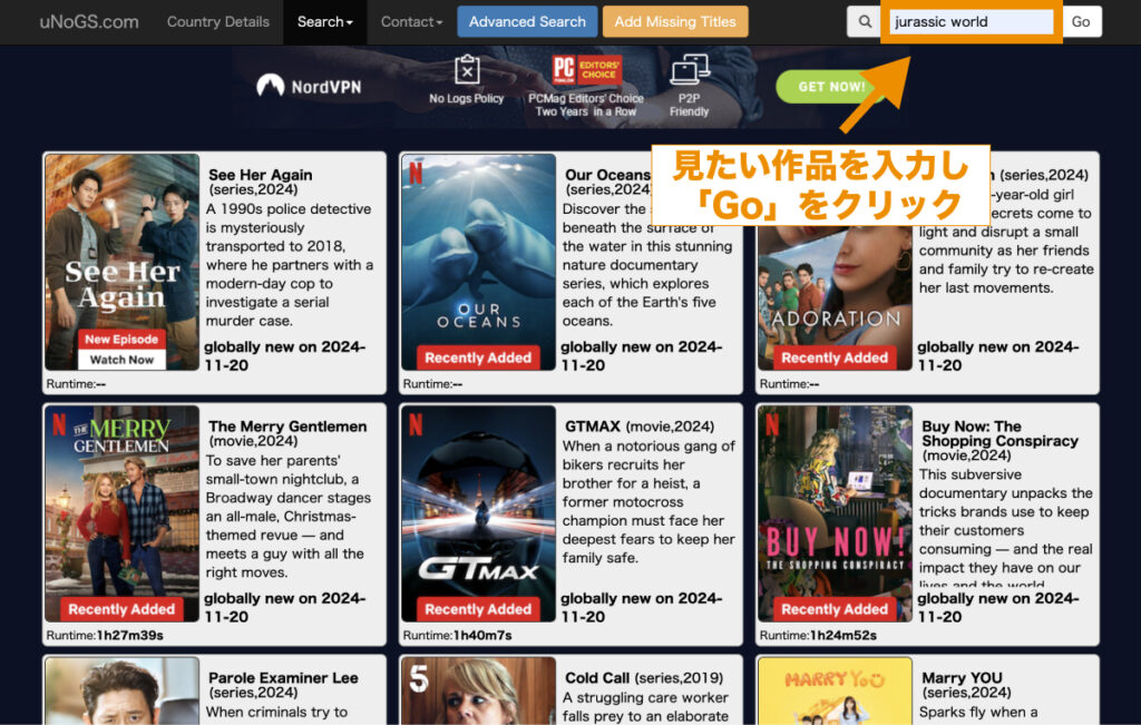 作品名から視聴できる国を探したい場合は、画面右上の検索窓に作品名を入力し、「Go」をクリックします。