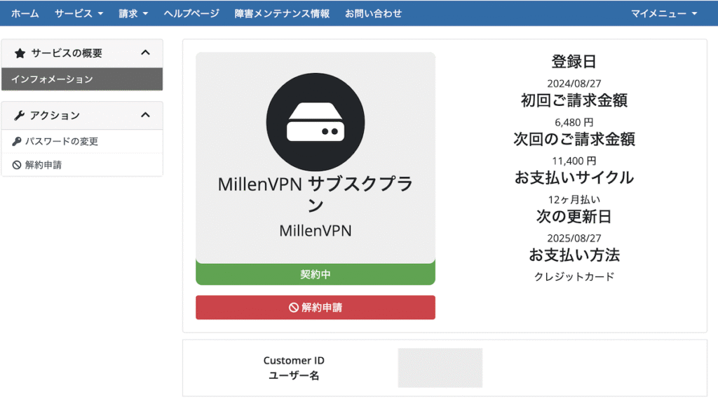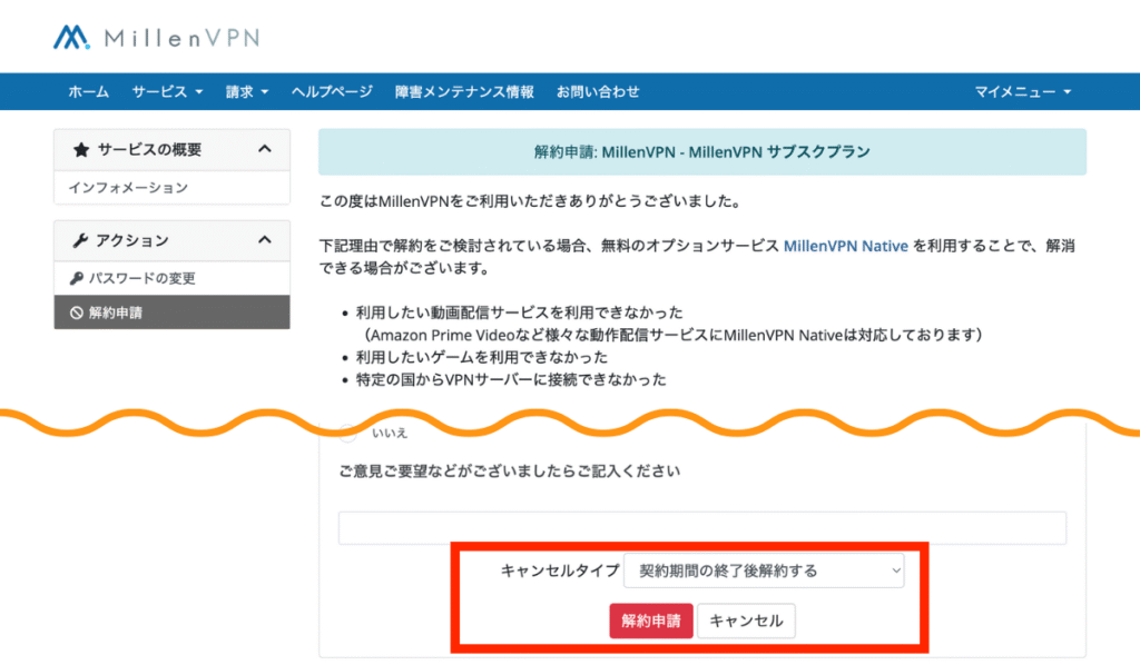 MillenVPNをサブスクで購入した場合自動更新設定になっています。自動更新を止めたい場合は解約手続きをする必要があります。