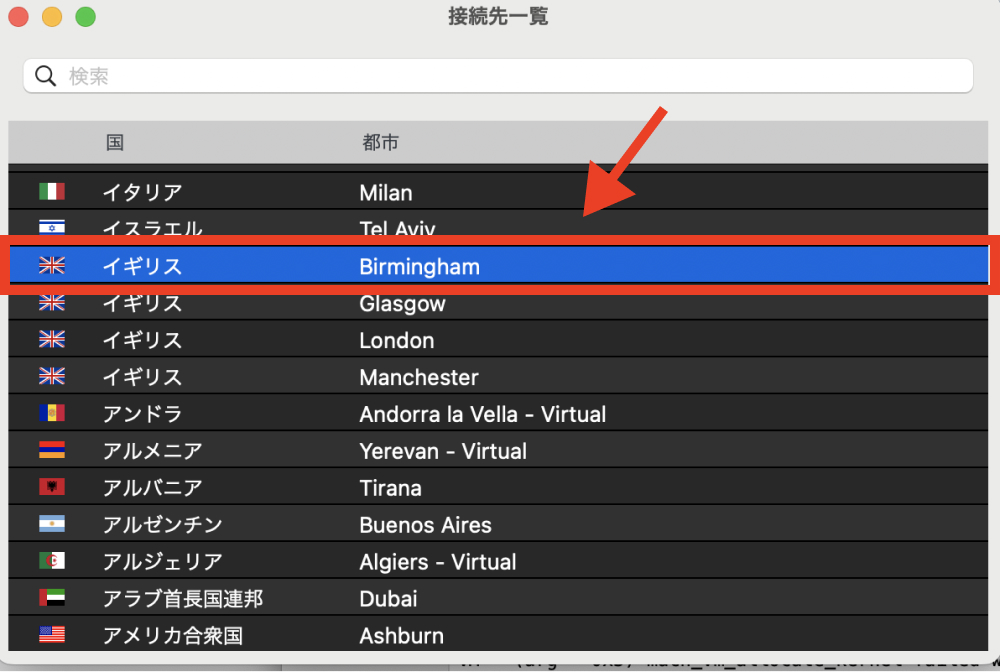 任意の接続先を選択しましょう。ジブリが見られる国は前述の通りです。(本例ではイギリスのサーバーに接続します。)